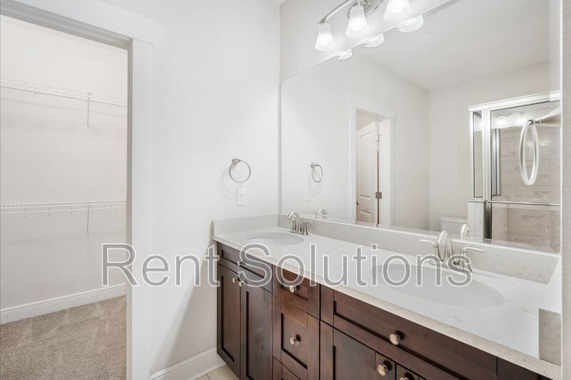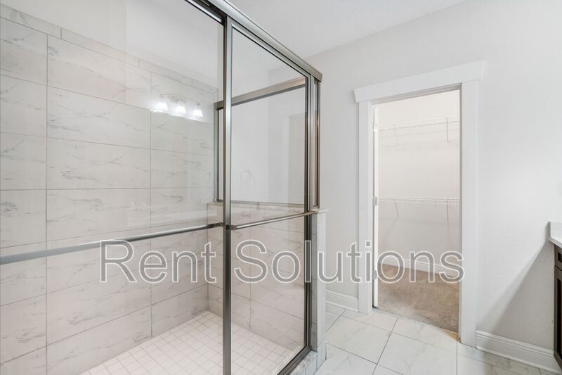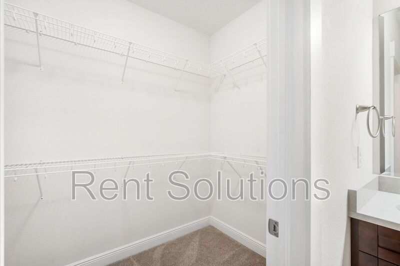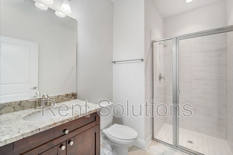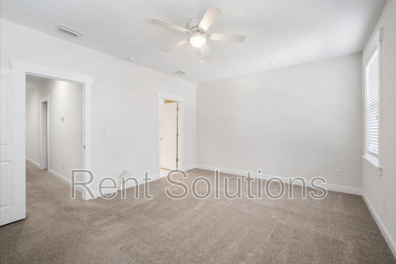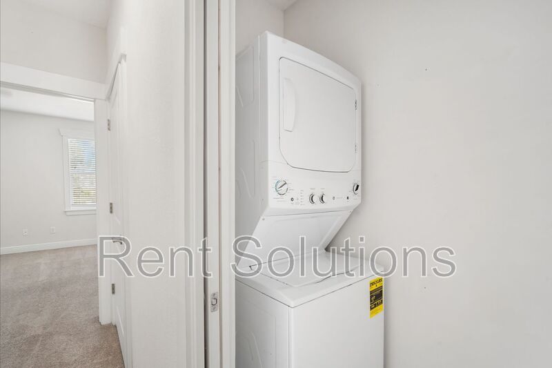 Upstairs, you’ll find the inside utility room equipped with a stackable washer and dryer, two additional guest bedrooms, a guest bathroom, and a spacious master suite. The master suite offers a walk-in closet and an ensuite bathroom complete with a private water closet, walk-in shower, and dual sink vanity with ample cabinet and counter space.