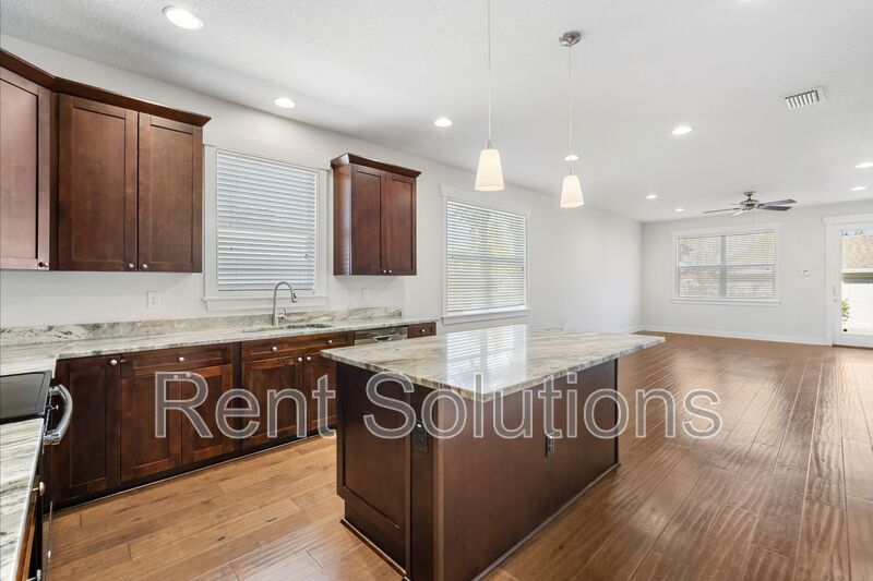 Step inside to a welcoming foyer featuring two storage closets and a convenient half bathroom, along with a first-floor guest bedroom. The open-concept kitchen serves as the centerpiece of the home, showcasing beautiful wood cabinetry, granite countertops, an island, a closet pantry, and modern stainless-steel appliances. The kitchen flows seamlessly into the large dining and family room area—ideal for entertaining—and provides direct access to the fenced backyard.
