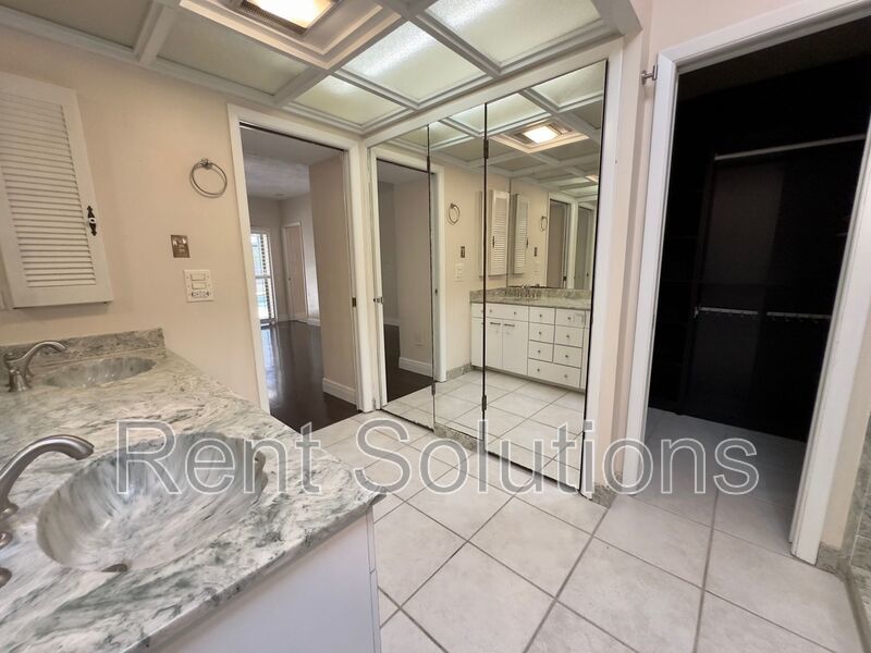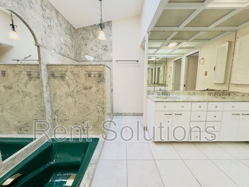 Four generously sized bedrooms, including one with plush carpet, plus an additional office space. The master suite is a true retreat with dual walk-in closets, an en suite bathroom featuring a sunken garden tub, walk-in shower, dual vanities, and extra storage.