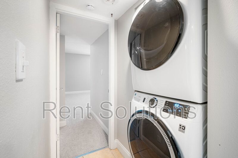 The primary bedroom includes a walk-in closet and an en-suite bathroom with a walk-in shower. The guest bedroom has a generous closet and is situated near the guest bathroom, which features a tub. A laundry closet with a full-size, stacked front-loading washer and dryer is conveniently located in the hallway. The living areas and bathrooms have ceramic tile flooring, while the bedrooms are carpeted for added comfort.