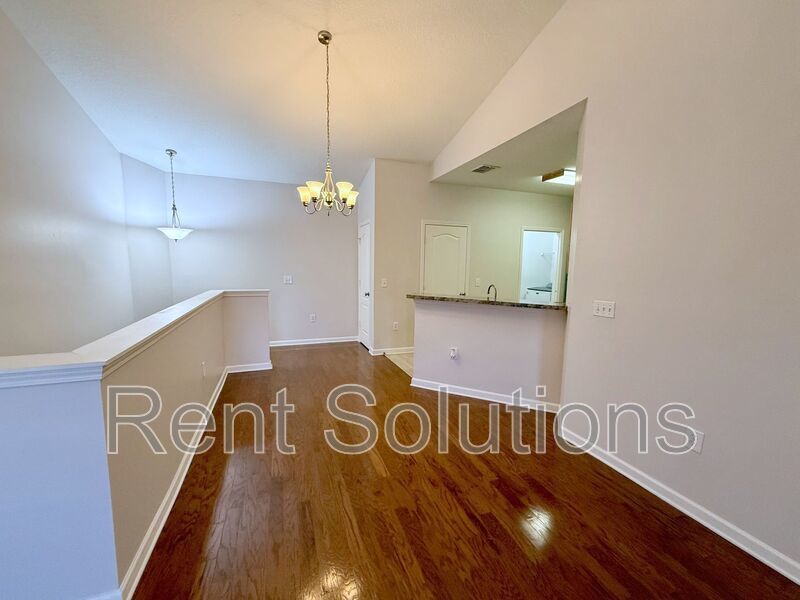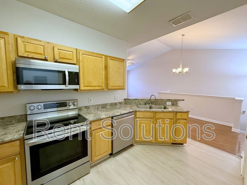 Step inside through the first-floor entry and head upstairs to a bright and open living room/dining room combo, complete with a French door leading to a generous covered balcony—perfect for relaxing outdoors. The well-appointed kitchen boasts wood cabinets, stainless steel appliances, a breakfast bar, and ample cabinet and counter space. Adjacent to the kitchen is a convenient utility room with a full-size washer and dryer.