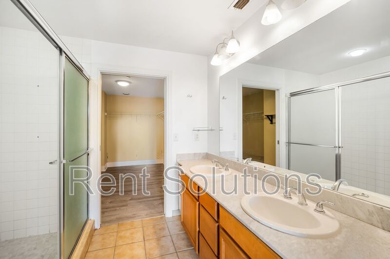 Tucked off the living area is the large master suite, showcasing elegant tray ceilings, a walk-in closet (Note: no longer has carpet), and an en-suite bathroom with double vanities, abundant counterspace, and a private water closet.
